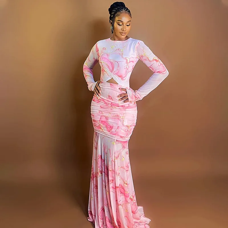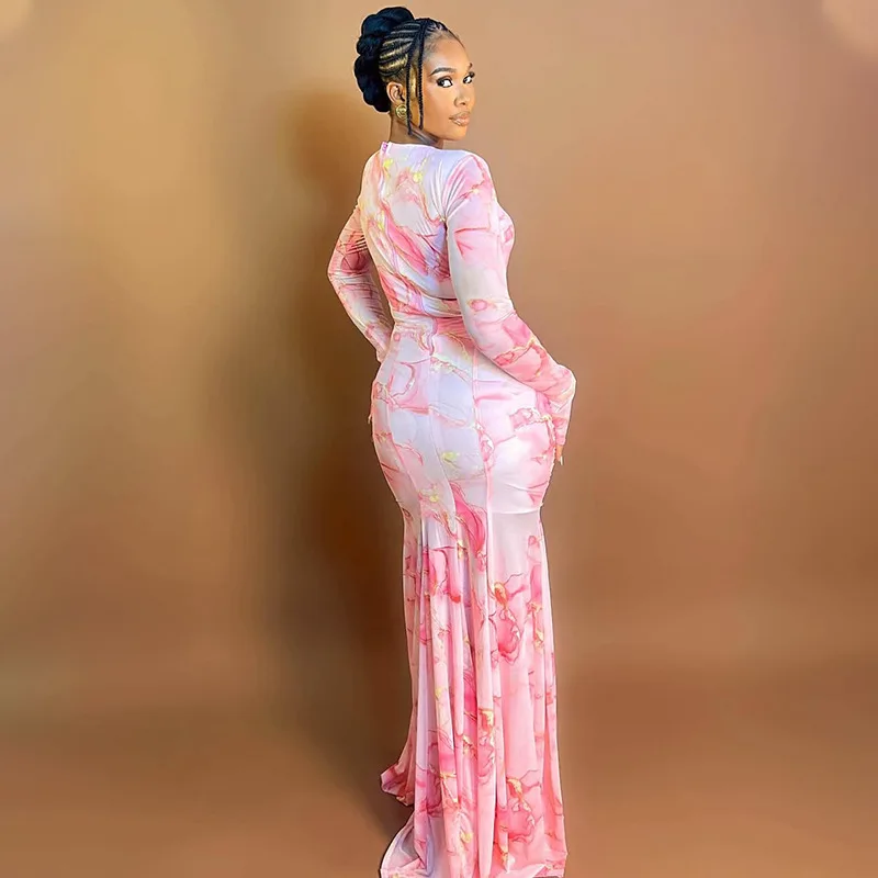 GX2962 Fashion Women's Long Sleeve Printed O-Neck Party Dress Sexy Tight Fit Elegant Evening Maxi Dresses